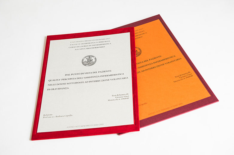 Tesi di laurea con frontespizio plastificato. Prima di copertina tranciata a caldo.